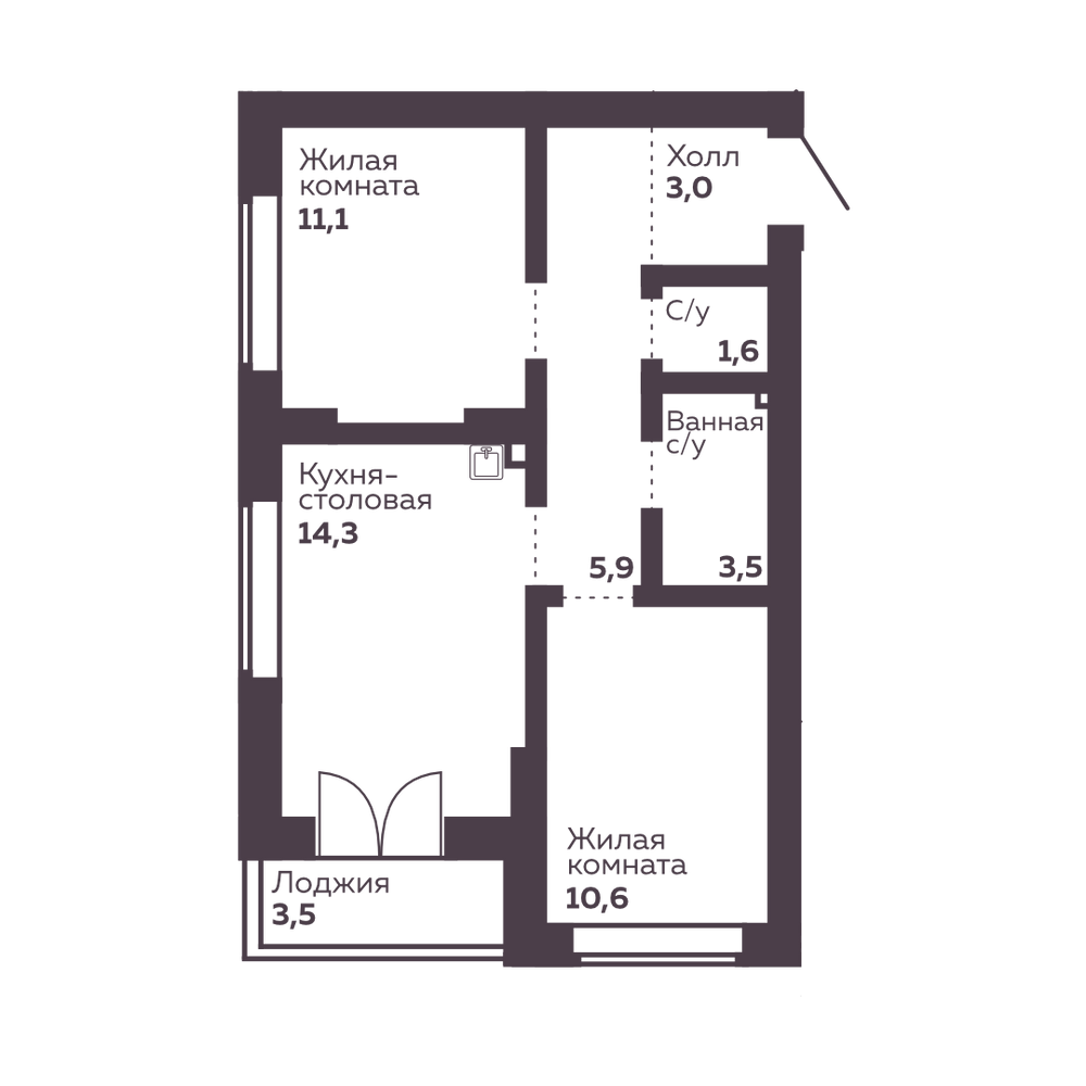 1-комнатная  45.7 м2